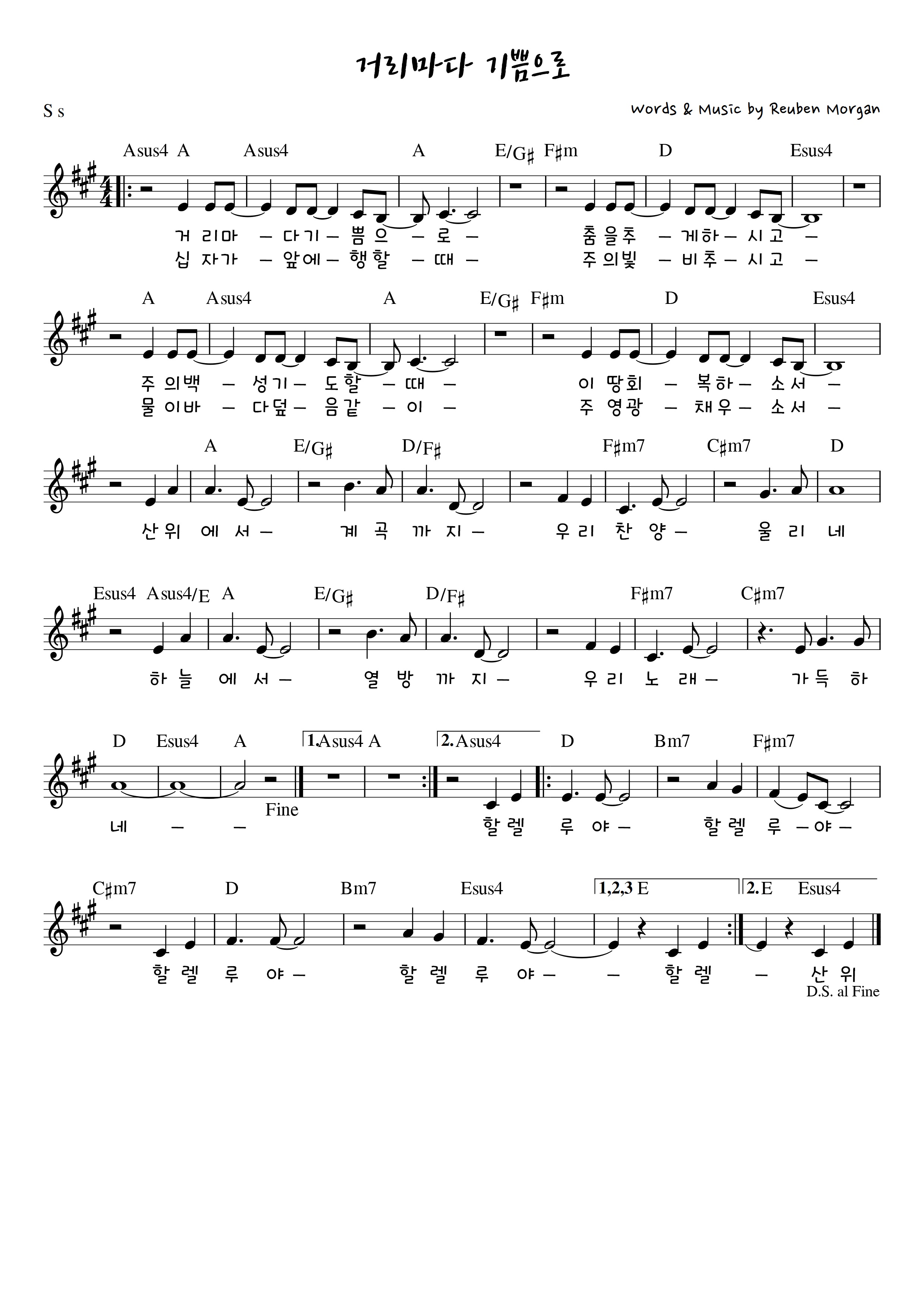 | 거리마다 기쁨으로 춤을 추게 하시고 주의 백성 기도할 때 이 땅 회복하소서 십자가 앞에 행할 때 주의 빛 비추시고 물이 바다 덮음 같이 주 영광 채우소서 산 위에서 계곡까지 우리 찬양 울리네 하늘에서 열방까지 우리 노래 가득하네 할렐루야 할렐루야 할렐루야 할렐루야 |