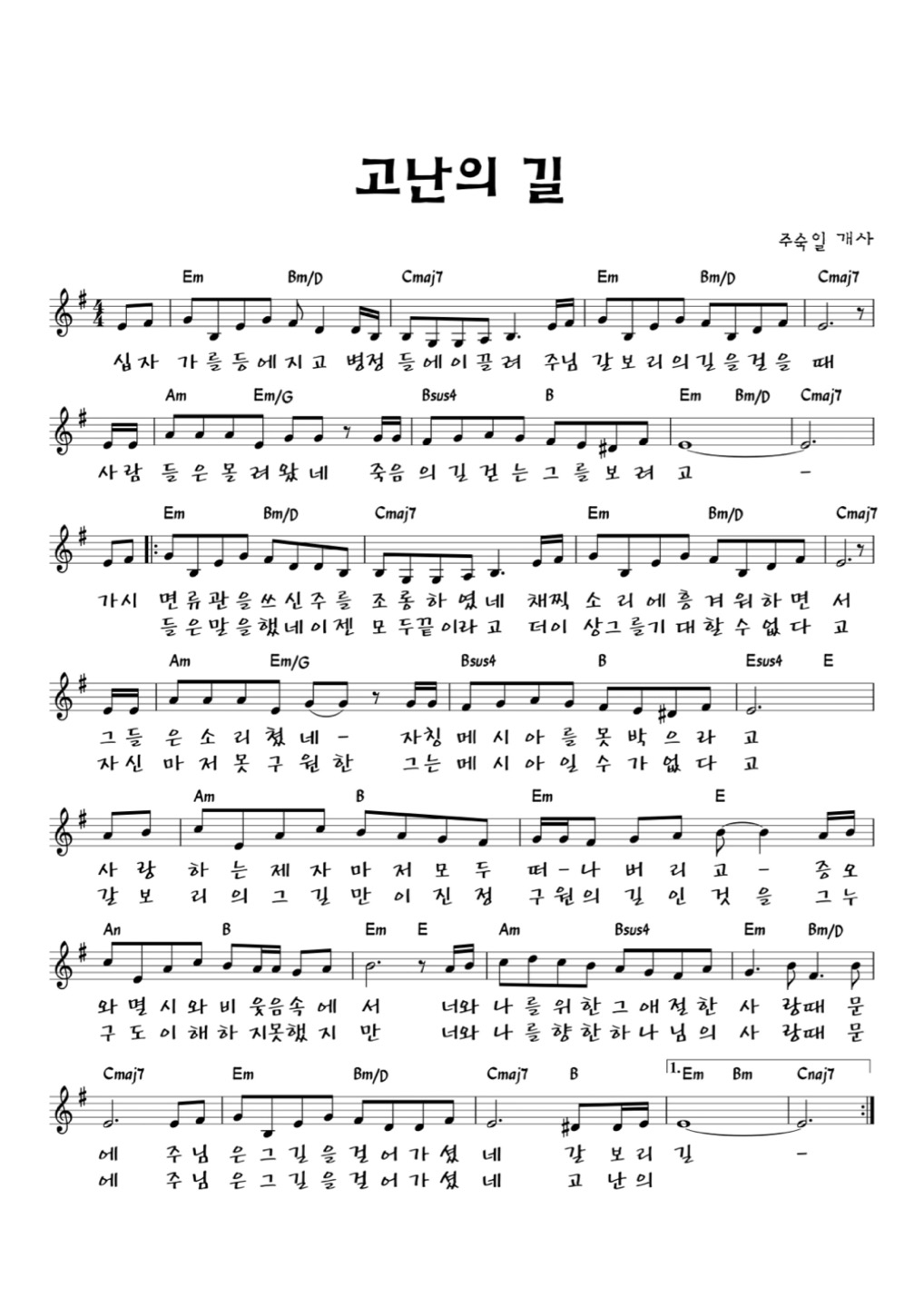 | 고난의 길(비아돌로로사) | 십자가를 등에 지고 병정들에 이끌려 주님 갈보리의 길을 걸을 때 사람들은 몰려 왔네. 죽음의 길을 걷는 그를 보려고. 가시 면류관을 쓰신 그를 조롱하였고 채찍 소리에 흥에 겨워 하면서 사람들은 소리 쳤네 자칭 메시아를 못박으라고. 사랑하는 제자 마저 모두 떠나버리고 증오와 멸시에 비웃음 속에서 너와 나를 위한 그 애절한 사랑때문에 주님은 그 길을 걸어 가셨네. 갈보리. 사람들은 소리쳤네 이젠 모두 끝이라고 세상 죄를 지고 가는 그의 앞에서 자신조차 못 구원한 그는 메시야 일수가 없다고 갈보리의 그 길만이 진정 구원의 길인 것을 그 누구도 이해할 수 없었지만 너와 나를 위한 그의 사랑 때문에 주님은 말도 없이 그 길을 가셨네 갈보리. 십자가에서 흘린 보혈은 예루살렘 유대와 땅 끝까지 구원의 강물이 되어 온 세상을 적셨고 세상의 그 모든 죄를 대속했네. 만 세상 사람들은 모두 비웃고 조롱하며 떠났던 바로 그 길을 이젠 너와 내가 가야만 하네 갈보리. |