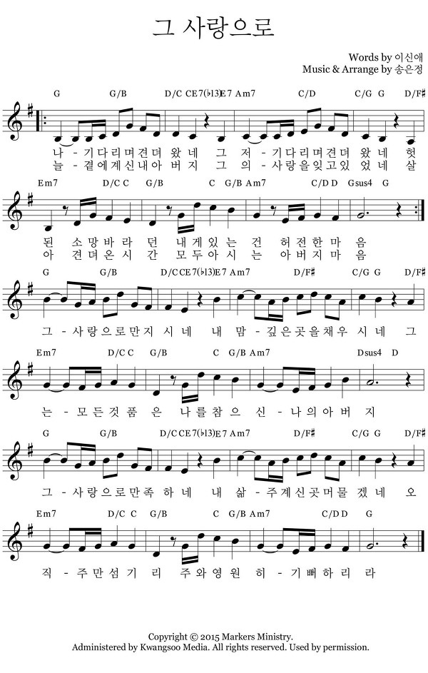 | 나 기다리며 견뎌왔네 그저 기다리며 견뎌왔네 헛된 소망 바라던 내게 있는 건 허전한 마음 늘 곁에 계신 내 아버지 그의 사랑을 잊고 있었네 살아 견뎌온 시간 모두 아시는 아버지 마음 그 사랑으로 만지시네 내 맘 깊은 곳을 채우시네 그는 모든 것 품은 나를 참으신 나의 아버지 그 사랑으로 만족하네 내 삶 주 계신 곳 머물겠네 오직 주만 섬기리 주와 영원히 기뻐하리라 |
