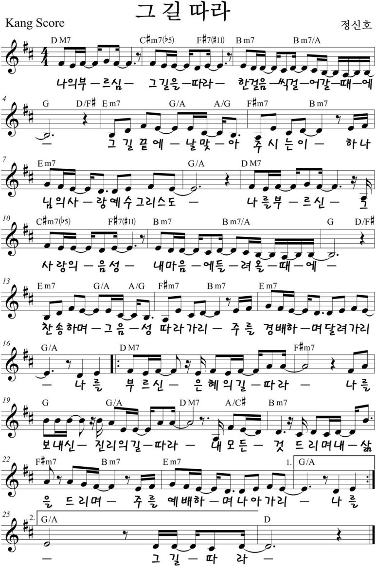 이번에는 정신호 목사님의 '그 길 따라'(나의 부르심)와 그 이름 아름답도다 D코드 찬양악보입니다.
