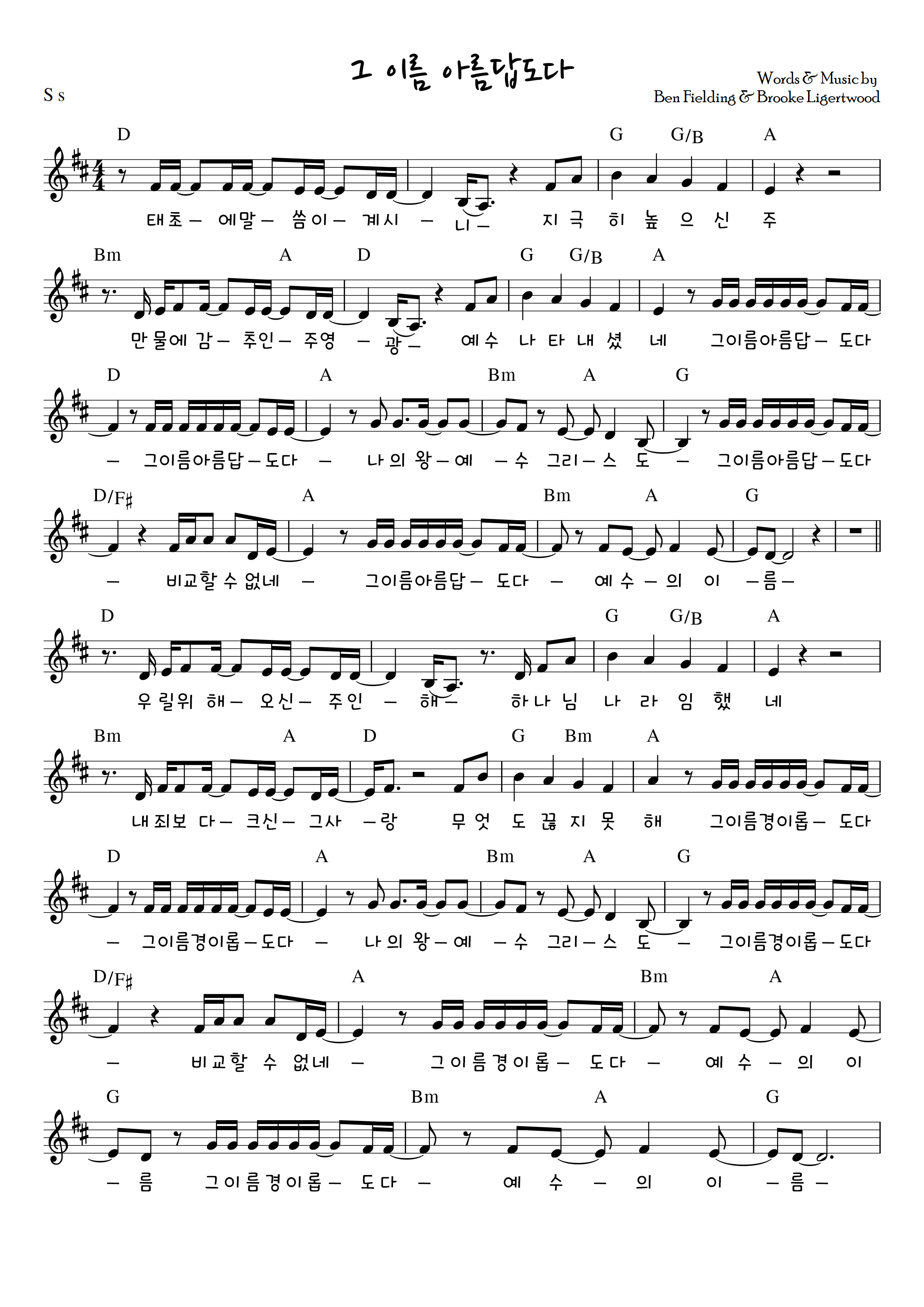 태초에 말씀이 계시니 지극히 높으신 주 만물에 감추인 주 영광 예수 나타내셨네 그 이름 아름답도다 그 이름 아름답도다 나의 왕 예수 그리스도 그 이름 아름답도다 비교할 수 없네 그 이름 아름답도다 예수의 이름