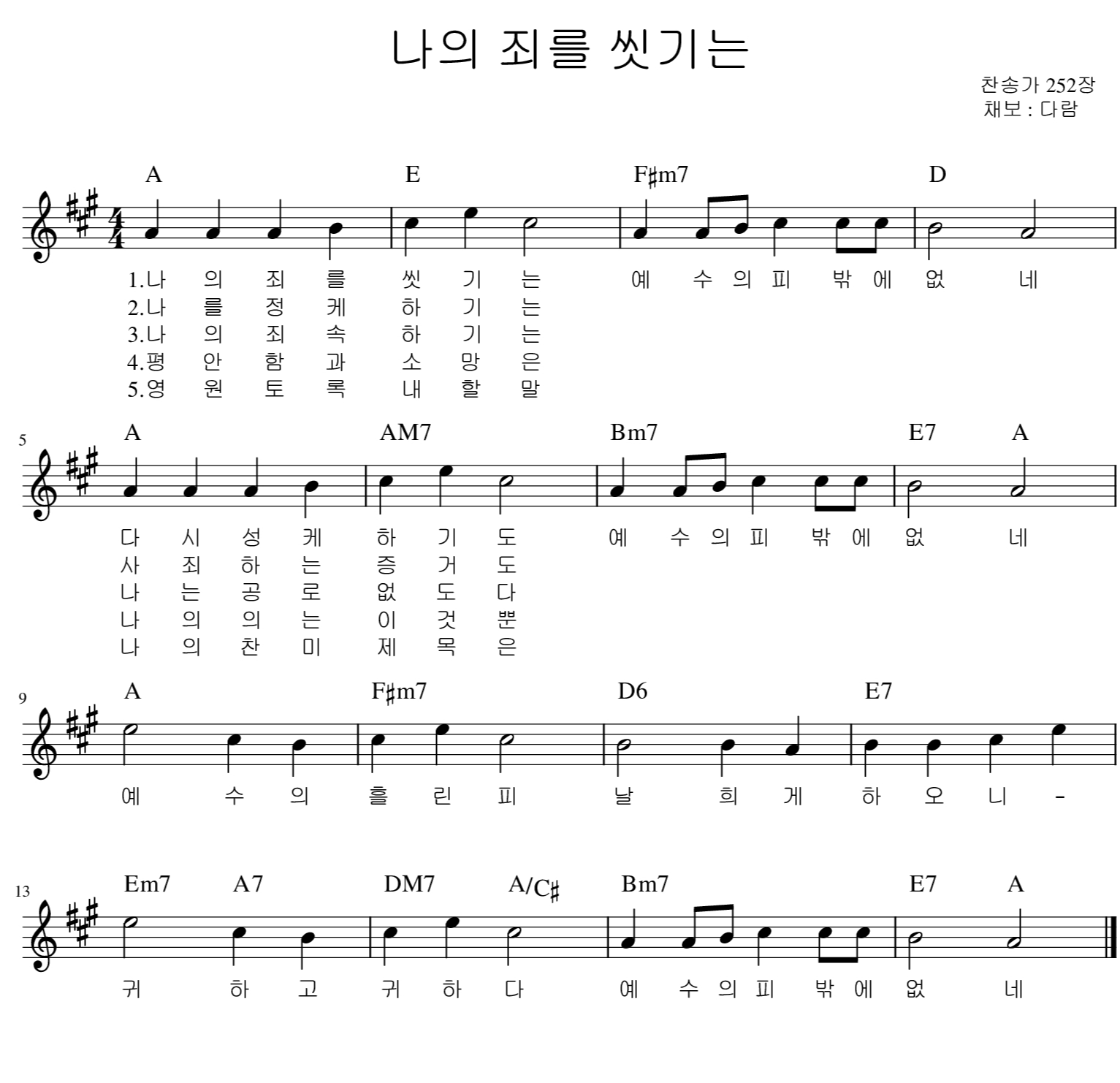 | 나의 죄를 씻기는 | 1. 나의 죄를 씻기는 예수의 피밖에 없네 다시 성케 하기도 예수의 피밖에 없네 2. 나를 정케 하기는 예수의 피밖에 없네 사죄하는 증거도 예수의 피밖에 없네 3. 나의 죄속하기는 예수의 피밖에 없네 나는 공로 없도다 예수의 피밖에 없네 4. 평안함과 소망은 예수의 피밖에 없네 나의 의는 이것 뿐 예수의 피밖에 없네 5. 영원토록 내 할 말 예수의 피밖에 없네 나의 찬미 제목은 예수의 피밖에 없네 <후렴>예수의 흘린 피 날 희게 하오니 귀하고 귀하다 예수의 피밖에 없네 |
