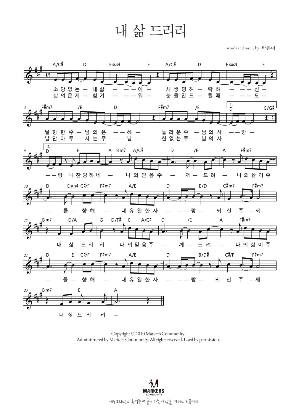 | 내 삶 드리리 | 소망 없는 내 삶에 새 생명 허락하신 날 향한 주님의 은혜 놀라운 주님의 사랑 삶의 문제 힘겨워 눈물만 드릴 때도 날 안아 주시는 주님 한없는 주님의 사랑 나 찬양하네 나의 믿음 주께 드려 나의 삶이 주를 향해 내 유일한 사랑 되신 주께 내 삶 드리리 나의 믿음 주께 드려 나의 삶이 주를 향해 내 유일한 사랑 되신 주께 내 삶 드리리 |