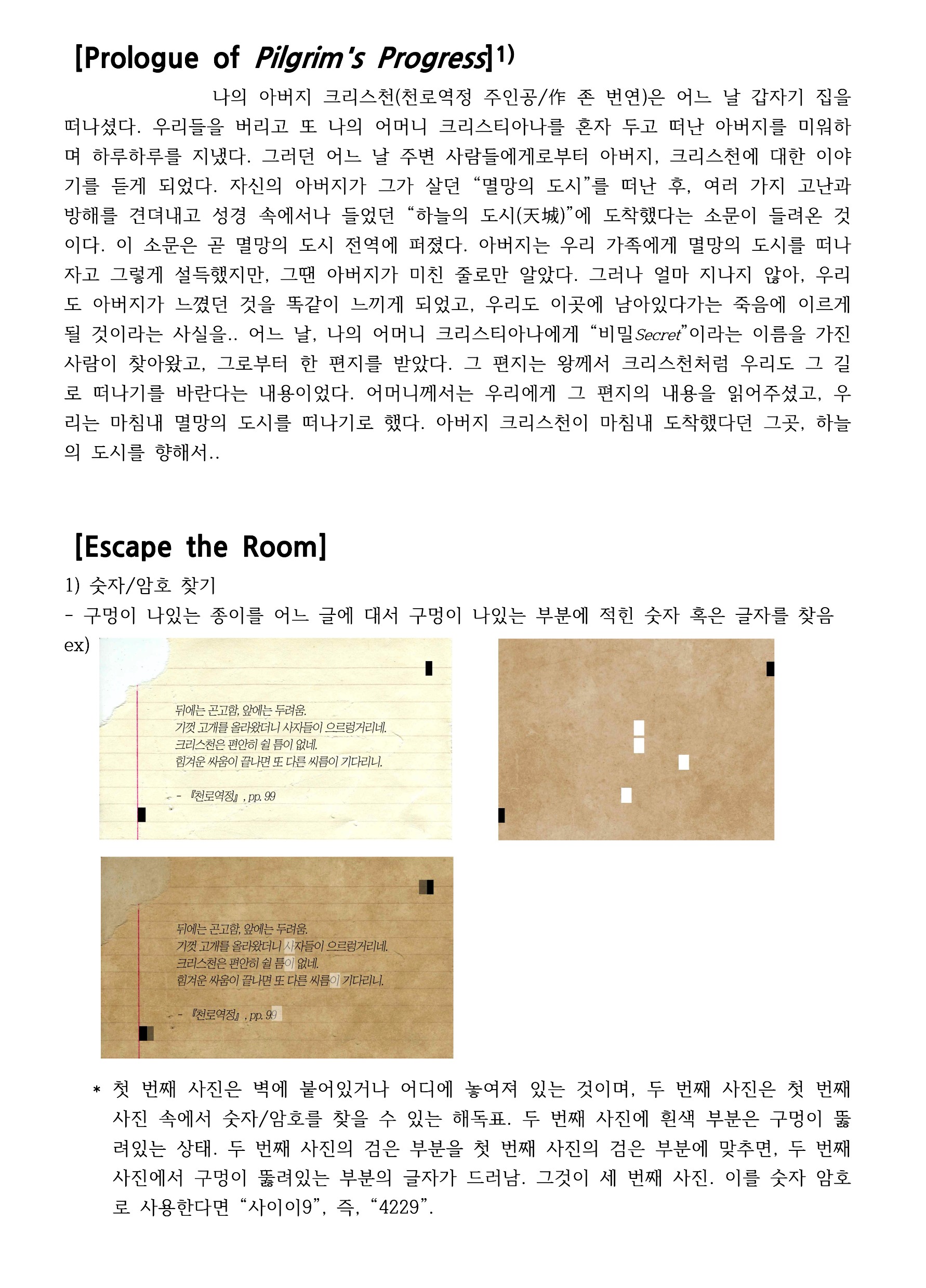 프로그램에 참여한 모든 분들이 확인할 수 있는 미션 종이 입니다. 이런 질문을 하나씩 해석해가며 방탈출 게임을 진행합니다. 고등부 아이들이 해결하지 못해서 쩔쩔매는 생각만해도 즐겁네요 :)