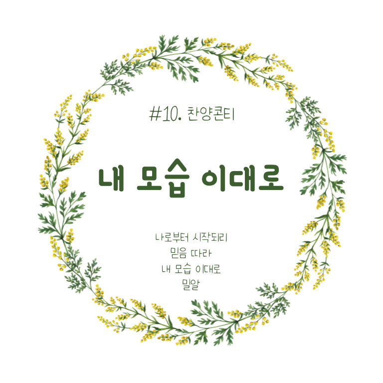 찬양콘티 주제 이번 찬양콘티 주제는 '나로부터 시작되리'입니다. 그리스도인이 되었다는 것은 예수님을 닮은 존재, 예수님을 닮아가는 존재로 살겠다는 결단입니다. 하지만 여전히 우리 마음