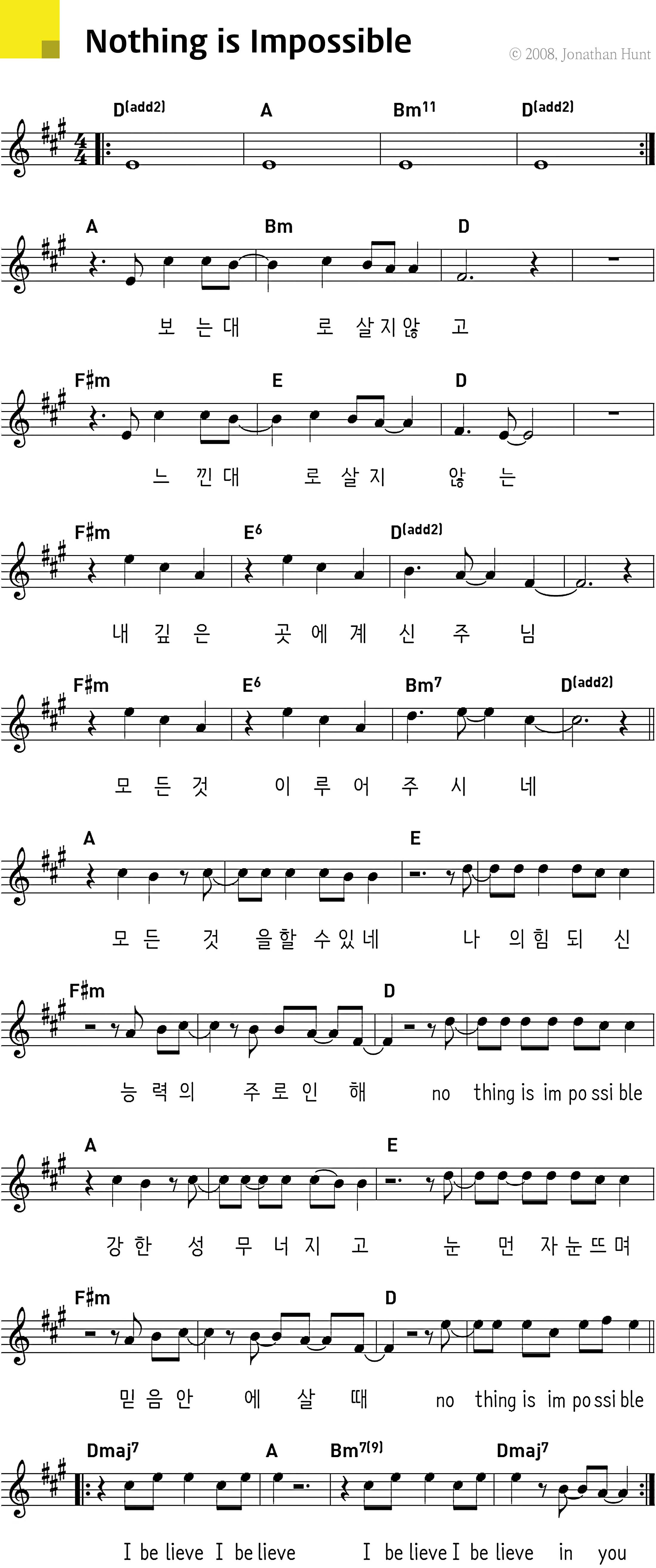모든 것을 할 수 있네 나의 힘되신 능력의 주로 인해 Nothing is impossible 강한 성 무너지고 눈먼 자 눈뜨며 믿음 안에 살 때 Nothing is impossible 보는 대로 살지 않고 느낀 대로 살지 않는 내 깊은 곳에 계신 주님 모든 것 이루어 주시네 모든 것을 할 수 있네 나의 힘되신 능력의 주로 인해 Nothing is impossible 강한 성 무너지고 눈먼 자 눈뜨며 믿음 안에 살 때 Nothing is impossible 보는 대로 살지 않고 느낀 대로 살지 않는 내 깊은 곳에 계신 주님 모든 것 이루어 주시네 모든 것을 할 수 있네 나의 힘되신 능력의 주로 인해 Nothing is impossible 강한 성 무너지고 눈먼 자 눈뜨며 믿음 안에 살 때 Nothing is impossible I believe(반복) I believe in you |